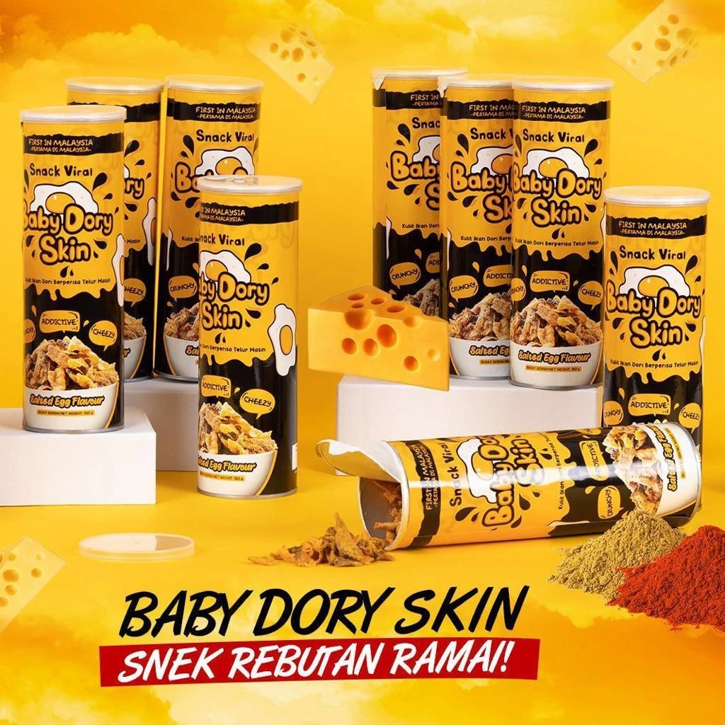 Diperbuat dengan penuh kasih sayang bersama Kulit Ikan Dori, Perasa Telur Masin, Perasa Campuran, Serbuk keju, Serbuk Kari, Serbuk Cili.